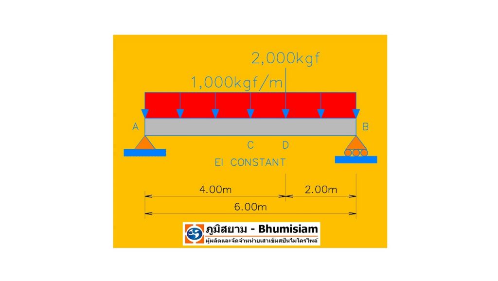 หากผมมีคานรับแรงดัดที่จะต้องรับน้ำหนักบรรทุกดังที่ได้แสดงอยู่ในรูป โดยคานจะต้องรับน้ำหนักบรรทุกแบบกระทำโดยแผ่กระจายตัวสม่ำเสมอหรือ UNIFORMLY DISTRIBUTED LOAD มีค่าเท่ากับ 1,000 กิโลกรัมต่อเมตร และ จะต้องรับน้ำหนักบรรทุกแบบกระทำเพียงจุดเดียวหรือ CONCENTRATED LOAD มีค่าเท่ากับ 2,000 กิโลกรัม ทั้งนี้คานรับแรงดัดของเรานั้นจะมีความยาวช่วงเท่ากับ 6.00 เมตร และทำจากเหล็กรูปพรรณที่มีค่าโมดูลัสยืดหยุ่นเท่ากับ 2×10^(6) กิโลกรัมต่อตารางเซนติเมตร และ มีค่าโมดูลัสความเฉื่อยของหน้าตัดเท่ากับ 10,000 ซม^(4)
