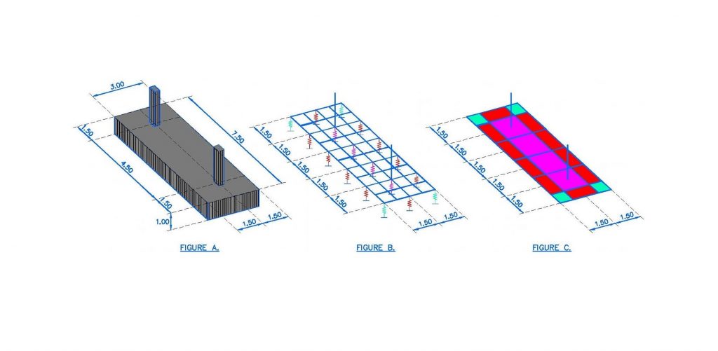 ผมมีฐานรากร่วมที่มีขนาดความยาวเท่ากับ 7.50 เมตร ความกว้างเท่ากับ 3.00 เมตร และความหนาเท่ากับ 1.00 เมตร ดังที่แสดงอยู่ในรูป A โดยที่ผมจะทำการสมมติให้ค่า q(u) และ Esoil ของดินนั้นมีค่าเท่ากับ 150 ตันต่อตารางเมตร และ 15,000 ตันต่อตารางเมตร ตามลำดับ โดยที่ผมจะทำการกำหนดให้ใช้คอนกรีตที่มีค่ากำลังอัดประลัยอ้างอิงตามตัวอย่างรูปทรงกระบอกมาตรฐานที่อายุ 28 วัน เท่ากับ 240 กิโลกรัมต่อตารางเซนติเมตร และ ค่าการทรุดตัวมากที่สุดของดินที่เรายินยอมจะให้เกิดขึ้นได้โดยที่ไม่ทำให้เกิดผลใดๆ ต่องานวิศวกรรมโครงสร้างของอาคารนั้นมีค่าเท่ากับ 20 มม ดังนั้นหากผมมีความต้องการที่จะทำการจำลองโครงสร้างนี้ในซอฟต์แวร์ไฟไนต์เอลีเมนต์ ซึ่งนั่นก็หมายความว่าผมจะต้องทำการคำนวณหาค่า Ksv ในรูปแบบค่าความแข็งแกร่งของสปริงเพื่อที่จะได้ทำการ INPUT ค่าคุณสมบัติของ BOUNDARY CONDITIONS เหล่านี้เข้าไปในซอฟต์แวร์ ผมจึงอยากที่จะขอให้เพื่อนๆ ทุกคนมาช่วยกันทำการคำนวณหาค่า Ksv และ Ksh ของฐานรากนี้ด้วยกันนะครับ