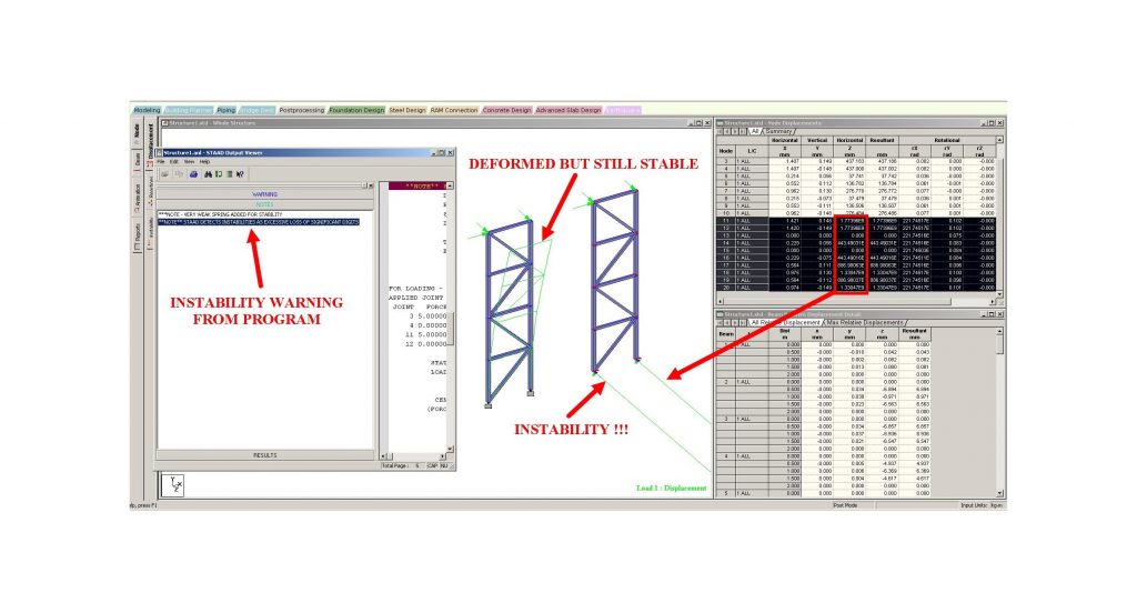โครงสร้างโครงเฟรมทางด้านซ้ายมือ คือ โครงสร้างโครงเฟรมที่ได้รับการจำลองให้จุดต่อนั้นมีความแข็งแรงที่มากเพียงพอ นั่นก็คือจุดรองรับที่เป็นแบบ FIXED SUPPORT กล่าวคือ จุดรองรับแบบนี้จะสามารถรับและถ่ายแรงได้เป็นอย่างดีในทุกทิศทุกทาง ซึ่งก็จะมีพฤติกรรมตามที่ผมได้เรียนไปว่า หากทางเจ้าของโชคดี จับใส่ชิ้นส่วนที่มีขนาดใหญ่เพียงพอ โครงสร้างโครงเฟรมนี้ก็จะยังมีความมั่นคงและยืนอยู่ได้ เมื่อใดที่เป็นเช่นนี้ก็หมายความว่า โครงสร้างโครงเฟรมๆ นี้จะอยู่ในสภาวะที่มีเสถียรภาพดีเพียงพอในทุกๆ แกนของโครงสร้าง