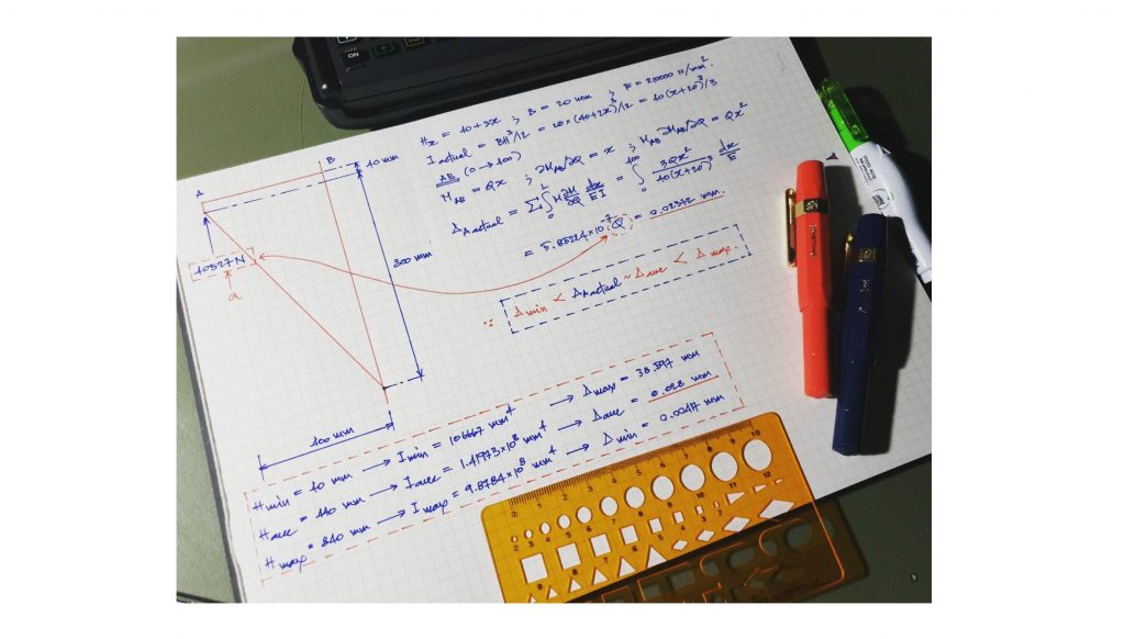 โดยที่ภายหลังจากการพิจารณาเรื่องรูปทรงและขนาดต่างๆ ของคานยื่นคานนี้ก็จะพบว่า ค่าน้ำหนักของตัวคานเองนั้นจะมีค่าที่น้อยมากๆ ผมจึงเลือกทำการไม่สนใจค่าน้ำหนักบรรทุกของตัวโครงสร้างไปและจากการหาค่าการเสียรูปของคานยื่นอันเนื่องมาจากแรงดัดที่ผมได้แสดงวิธีการทำไปในเมื่อวานนี้ก็จะพบว่าค่าการเสียรูปจะมีค่าประมาณ