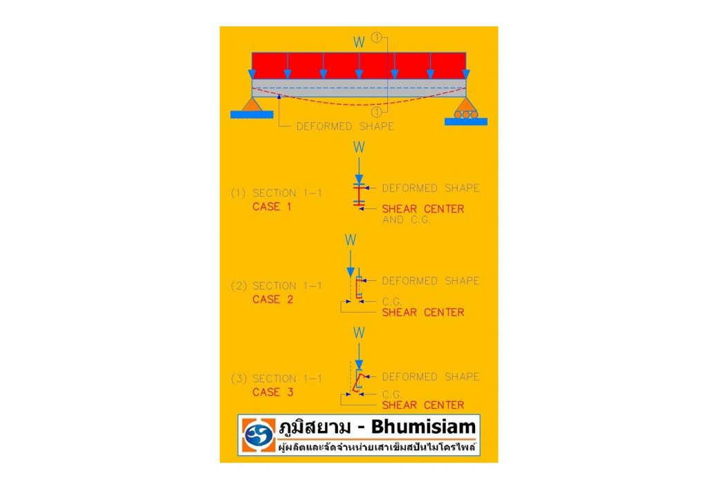 กรณีที่ 3 โครงสร้างของคานที่มีหน้าตัดเป็นหน้าตัดแบบที่มีความ “ไม่สมมาตร” และแนวของการถ่ายน้ำหนักของหน้าตัดประเภทนี้ตรงกันกับแนวจุดศูนย์ถ่วงของหน้าตัด