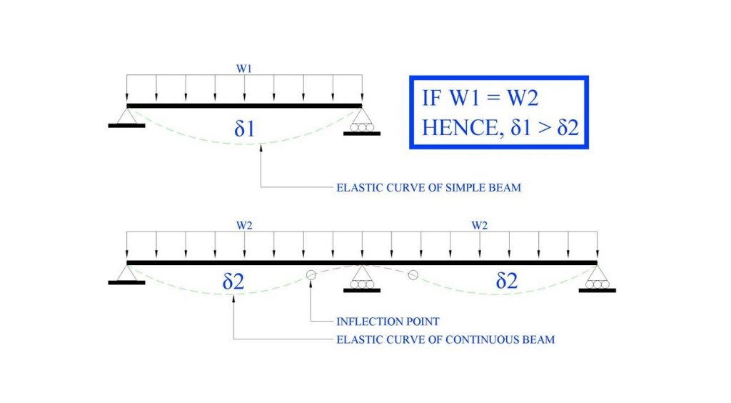 ในรูปที่ผมแสดงในโพสต์นี้เป็นการอธิบายความแตกต่างของพฤติกรรมการโก่งตัวเปรียบเทียบกันระหว่างคานช่วงเดียวและคานต่อเนื่องนะครับ โดยหากคานมีขนาดหน้าตัด ช่วงว่าง และ นน บรรทุกที่เท่ากันๆ ค่า DISPLACEMENT ที่เกิดขึ้นมากที่สุดใน คานช่วงเดียว ย่อมที่จะมีค่าสูงกว่า คานต่อเนื่อง ดังนั้นเราเพื่อความประหยัดในการออกแบบ วิศวกรจึงนิยมที่จะทำการออกแบบให้คานมีลักษณะเป็นคานต่อเนื่องกันไป ซึ่งก็จะตรงตามหลักการและเหตุผลประการนี้นั่นเองครับ