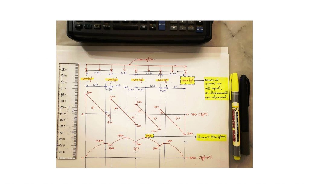จากนั้นเราก็นำค่าน้ำหนักบรรทุกในแนวดิ่งทั้งหมดที่กระทำบนพื้นกับค่าของแรงปฏิกิริยา ณ จุดรองรับทุกๆ จุดของโครงสร้างมาทำการวิเคราะห์โครงสร้างโดยการเขียน แผนภาพแรงเฉือน หรือ SHEAR FORCE DIAGRAM และ แผนภาพแรงดัด หรือ BENDING MOMENT DIAGRAM ก็เป็นอันเสร็จเรียบร้อยครับ